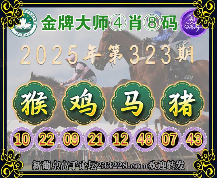 323期:【金牌大师】 🏵️④肖⑧码🏵️【猴鸡马猪】开:鸡09准